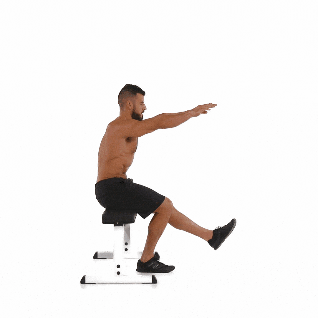 - Отведите бедра назад и приседайте, пока слегка не коснетесь ягодицами стула/ящика. Держите другую ногу перед собой, чтобы сохранить равновесие.