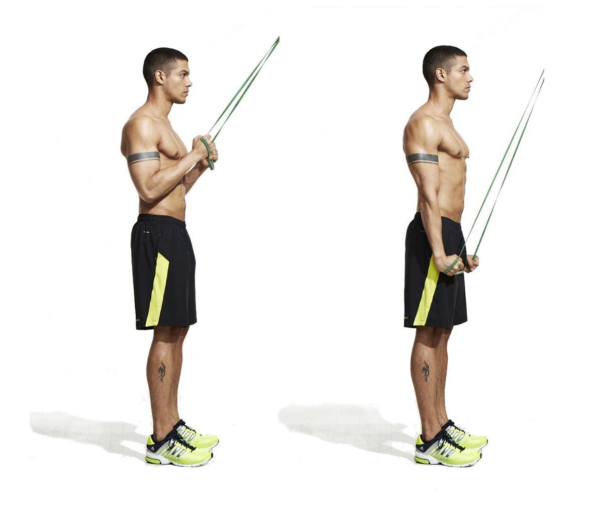 Данное упражнение лучше всего выполнять либо с разомкнутой резиновой лентой, либо с резинкой со специальными рукоятками. Зажмите нижний край ногами, после чего сгибайте руки в локтях за счет силы бицепса. Следите за тем, чтобы локти не изменяли положения и не уходили вперед (либо прижимайте их к поясу).