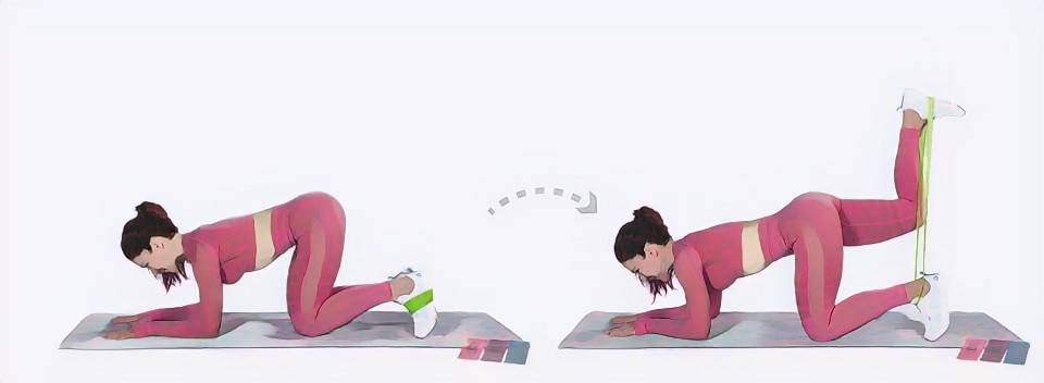 - Для работы с внутренней частью бедра и мышцами ягодиц, подойдет данное упражнение: поместить мини-ленту на колени, затем встать на четвереньки и как можно дальше отвести ногу в сторону. Максимально отведя ногу, выдержать паузу или попросту поружинить.