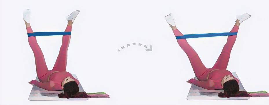 Для выполнения необходимо перелечь на спину, ноги поднять прямыми. Фитнес резинка по-прежнему остается на бедрах чуть выше коленного сустава. Медленно разводите ноги в сторону напрягая внутреннюю часть бедра, задерживайтесь на несколько секунд и также медленно возвращайтесь в исходное положение. Здесь нельзя быстро разводить и сводить ноги, тогда не будет эффекта.