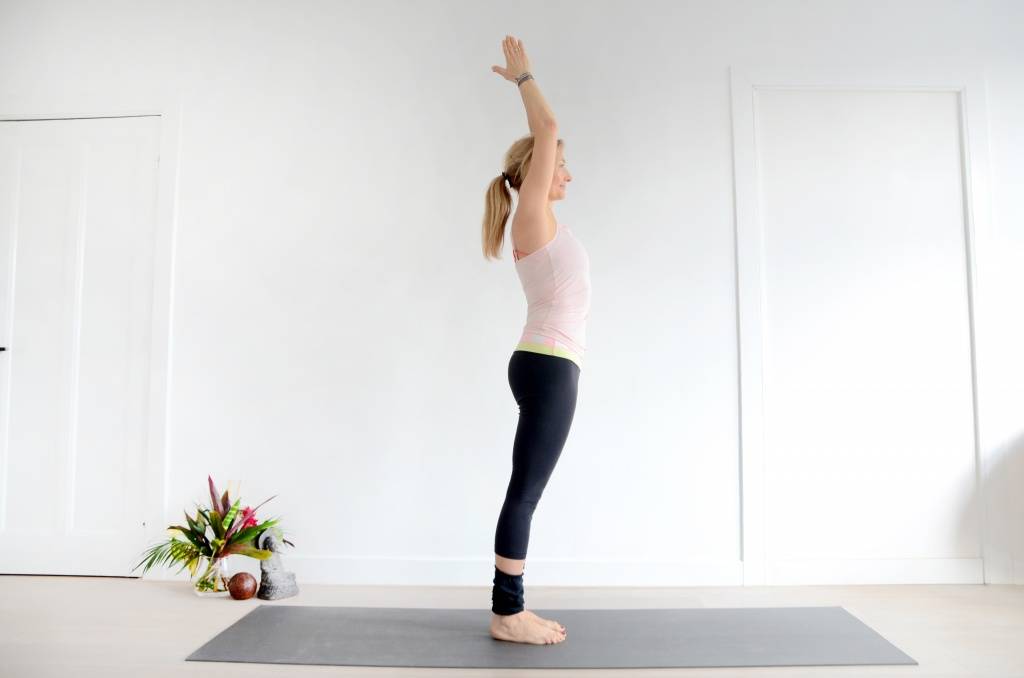 - Встаньте прямо, спину держите ровно. Поднимите руки вверх в замке, начинайте тянуться.