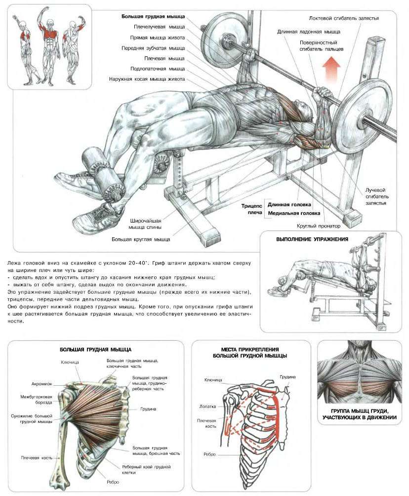 Такой жим больше напрягает нижнюю часть груди. Если вашу скамью можно направить вниз, то отрегулируйте ее под угол в 10-15 градусов — т.е. так, чтобы голова находилась чуть ниже бедер. А если скамья не регулируется таким образом? Тогда просто приподнимите один край скамьи и поместите его на любую опору.