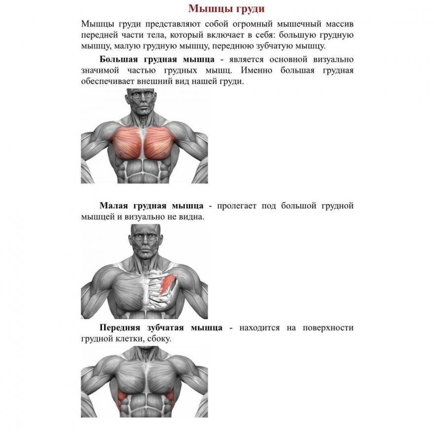 При прокачке груди задействуются: пресс, руки (бицепсы, трицепсы), спина и дельтовидные мышцы плеч, то есть, вся верхняя часть тела. Грудные мышцы разделены на симметричные группы, которые состоят из: