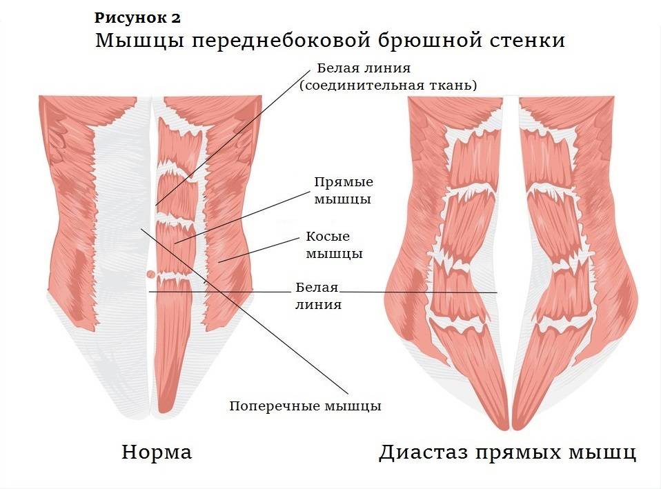 Брюшная стенка состоит из поддерживающей и связывающей ткани, включая коллагеновые волокна. Из-за гормонов беременности натяжение волокон уменьшается, и они начинают растягиваться, а мышцы живота уступают место растущему ребенку. Разделение прямых мышц живота по средней линии соединительной ткани, соединяющей их (linea alba), называется диастазом. Linea alba проходит от нижней части грудины до верхней части лобковой кости и обычно имеет ширину около 1 см. Диастаз может возникать в любом месте от верха до низа средней линии. После родов этот процесс саморазрешится, и волокна коллагена восстановят свою обычную тяговую силу. Тем не менее, длительное растяжение или разрыв волокон может привести к тому, что связывающая ткань не сможет полностью восстановиться.