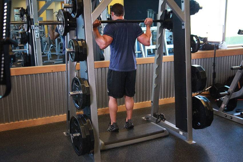 Подъемы на пятках. Выполняются в тренажере Смитта. Необходимо стать пятками на край платформы, носки опущены вниз. Поднимайте их плавными движениями, без рывков, а опускайте медленно, поддерживая ритм.