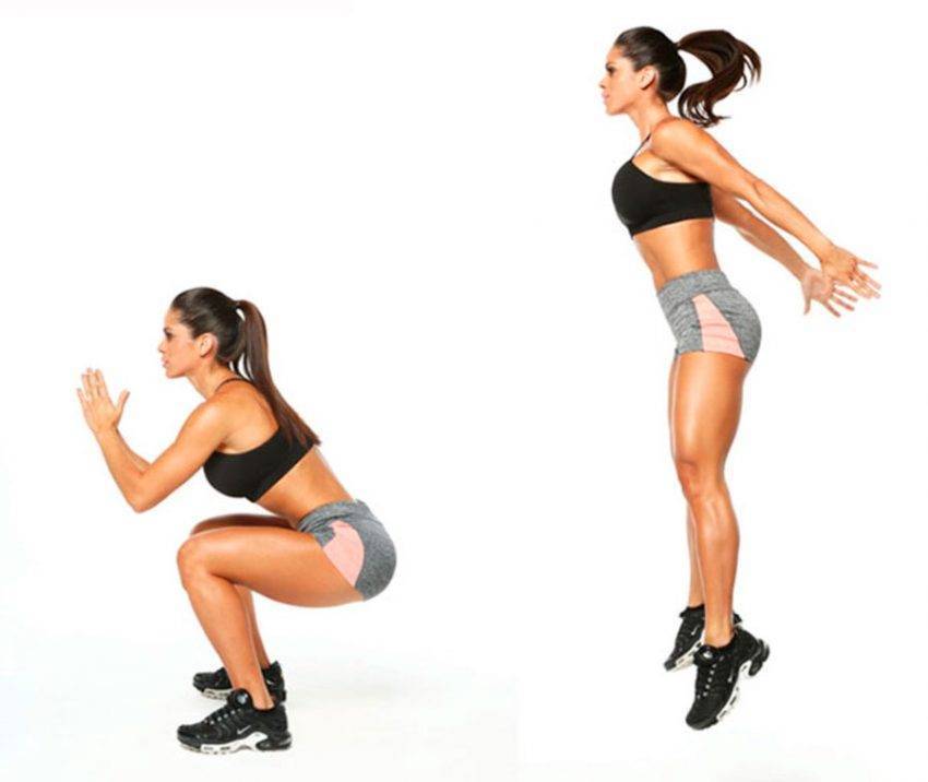 - Приседание с выпрыгиванием помогает тонизировать мышцы ног, ягодиц и пресса, улучшает качество тела.