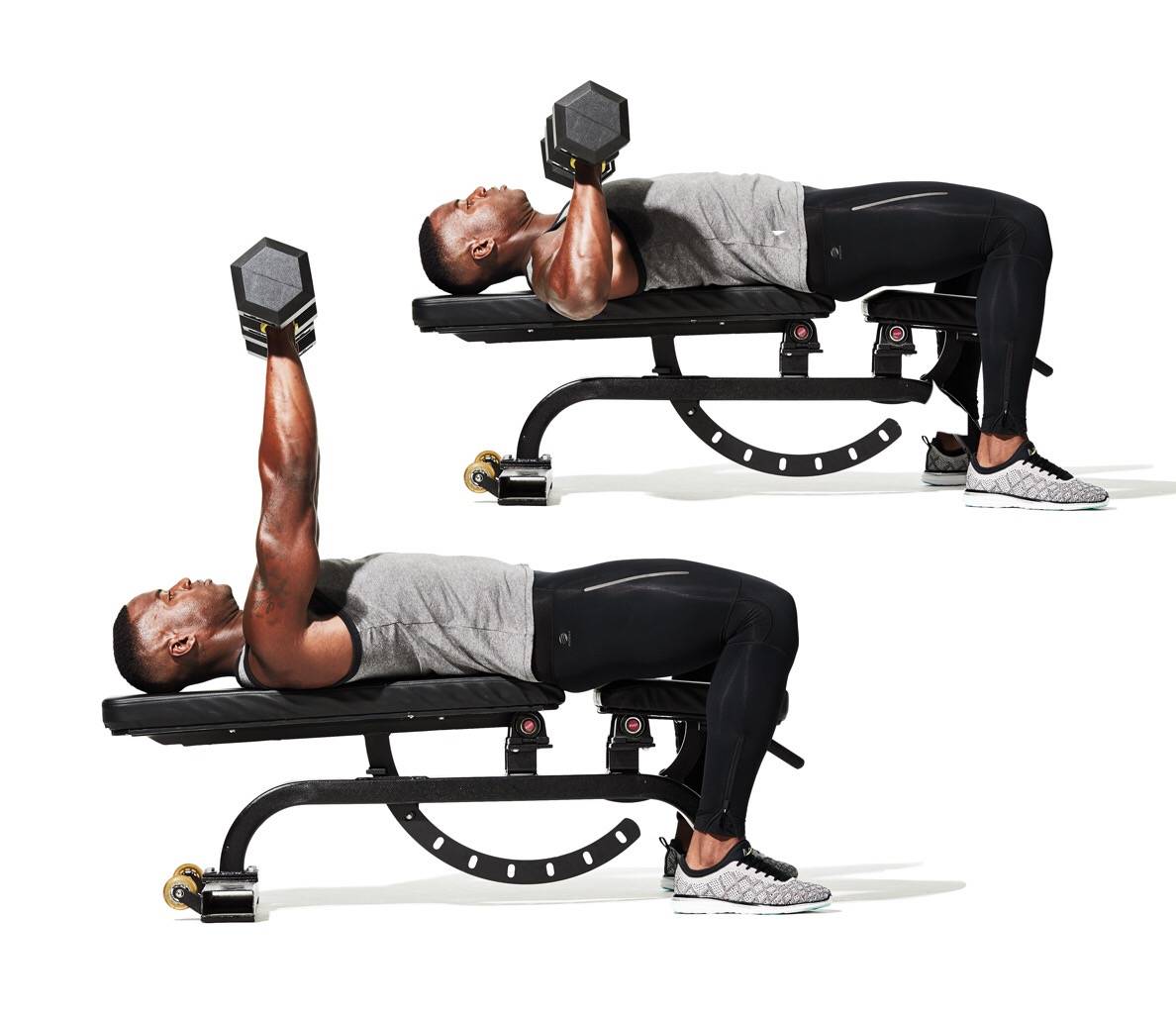 - Чередуйте жим гантелей с отжиманиями и разведениями гантелей в стороны.