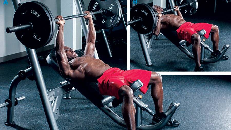 Лежать нужно, наклонив спинку скамьи под углом 20–45 градусов. Меньше не имеет смысла — нагрузка смещается на передние дельты. Еще здесь необходимо тщательнее следить за уровнем опускания локтей.