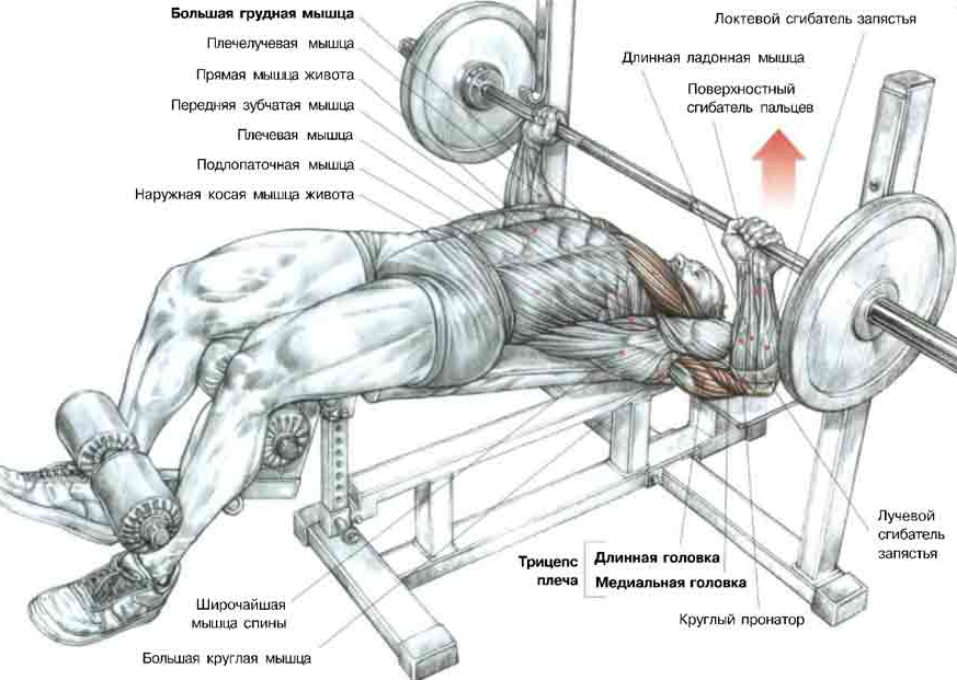 Жим штанги, лежа на скамье (прямой или наклонной), — одно базовых силовых упражнений, развивающих мускулатуру всего тела наиболее эффективно и комплексно. Чтобы в этом убедиться, достаточно лишь ознакомиться с тем, какие мышцы работают при жиме:
