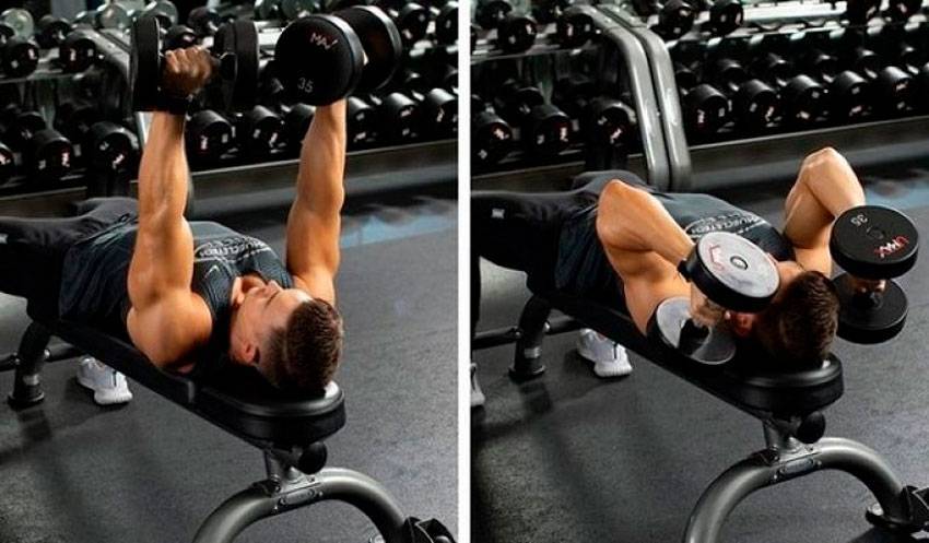 Классическая вариация выполнения французского жима с гантелями – лежа. Именно с неё следует начинать новичкам, чтобы освоить биомеханику движения и только потом переходить к остальным вариациям.