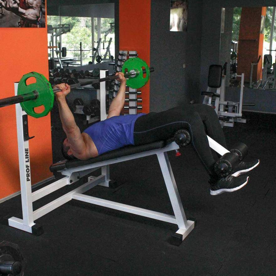 Желательно, чтобы скамья была со стойками. Если такого оборудования нет, потребуется ассистент, который будет подавать штангу.