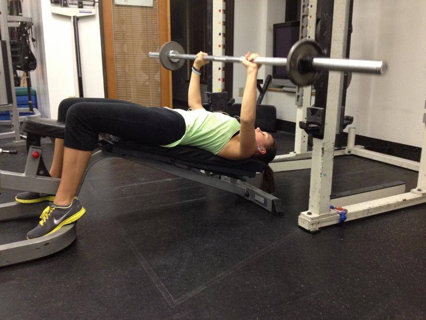 - Ложатся на скамью так, чтобы гриф был над головой, ступнями ног упираются в пол.