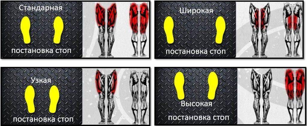 Если поставить ноги выше середины, то начинают сильнее работать бицепсы бедер и мышцы ягодиц. Если ниже середины, большую нагрузку получают квадрицепсы. Широкая постановка ног сконцентрирует нагрузку на приводящие мышцы внутренней поверхности бедра, а узкая постановка на латеральные головки квадрицепсов.