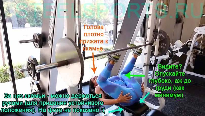 - Спину от спинки отрывать не нужно, равно как и выдвигать плечи вперед либо кивать головой. Эти «вспомогательные движения» мешают техничному выполнению упражнения и не дают активизировать мышцы груди;